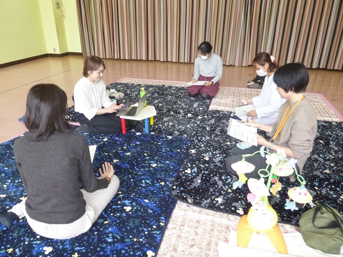 親同士の交流の場、子育て相談のできる集いの場です。親子で一緒に手遊びやふれあい遊びをしたり、遊びの紹介や絵本の読み聞かせをしたりしています。