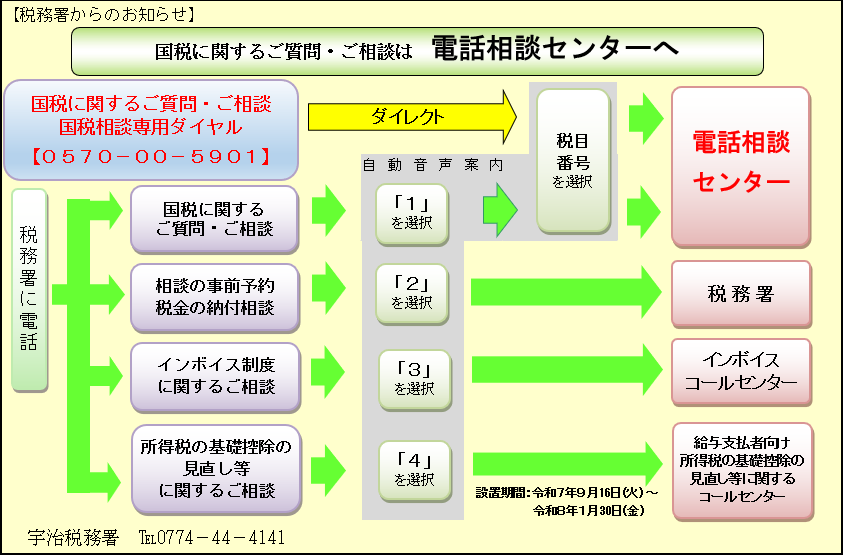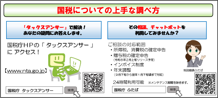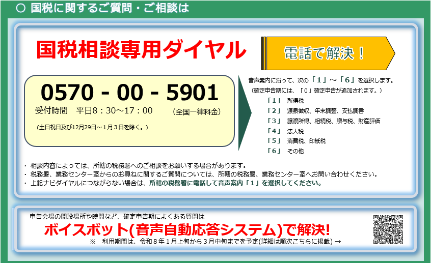 国税に関するご質問・ご相談については国税庁ホームページのタックスアンサーやチャットボット、国税相談専用ダイヤル(0570-00-5901)をご活用ください。詳しくは、国税庁のホームページをご覧ください。