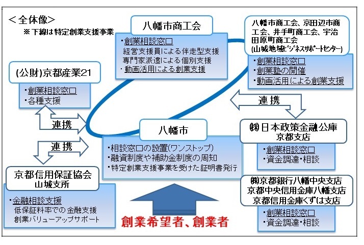 平成26年1月20日に施行された「産業競争力強化法」に基づき、八幡市が創業支援事業者と連携して作成した「八幡市創業支援事業計画」について、平成28年1月に国の認定を受けました。これにより、同法第2条第33項に規定する本市の「特定創業支援事業」(注)による支援を受けた方には、本市の証明により、同法における支援を受けることができますので、積極的にご活用ください。