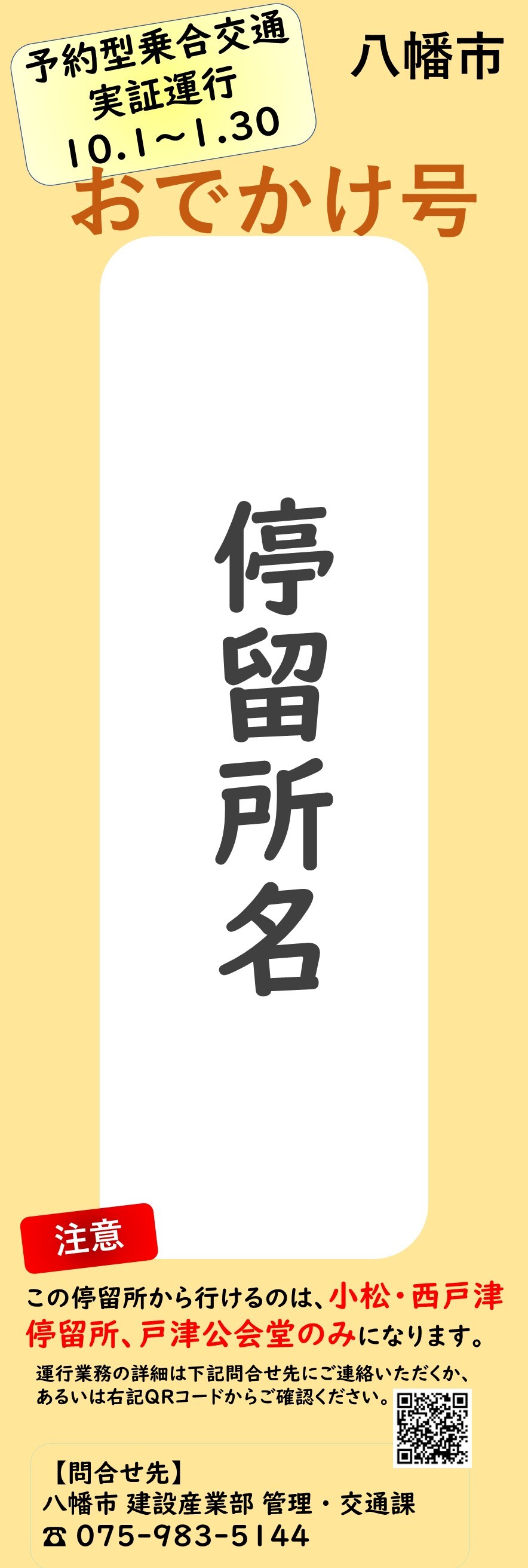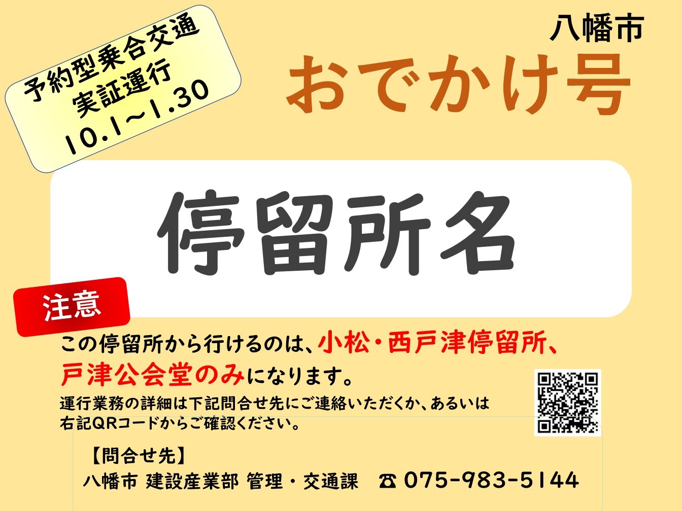 八幡市では、国の補助金を活用した実証運行として、戸津・小松停留所周辺にお住まいの人の移動支援と今後の予約型交通の導入を検討する際の参考とするため、10月1日(水曜日)からおでかけ号(予約型乗合交通)の運行を始めます。