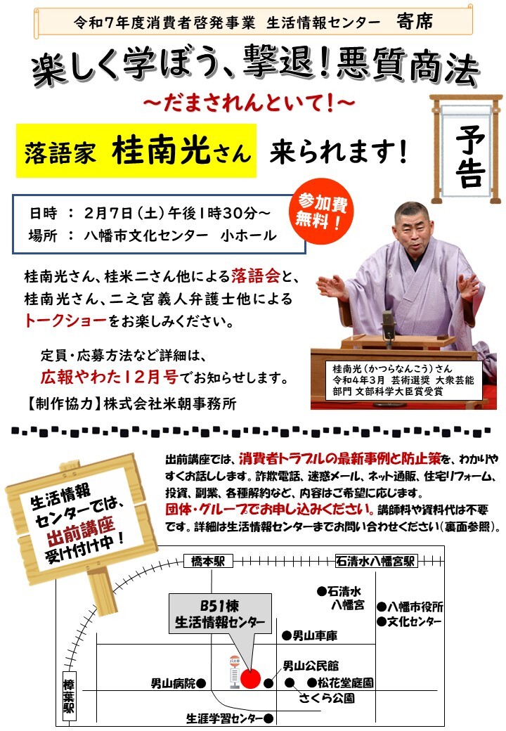 日時は、2026年2月7日(土曜日)午後1時30分より、場所は、八幡市文化センターの小ホールにて、桂南光さん、桂米二さん他による落語会と、桂南光さん、二之宮義人弁護士他によるトークショーをお楽しみください。定員・応募方法など詳しくは、広報やわた12月号でお知らせします。