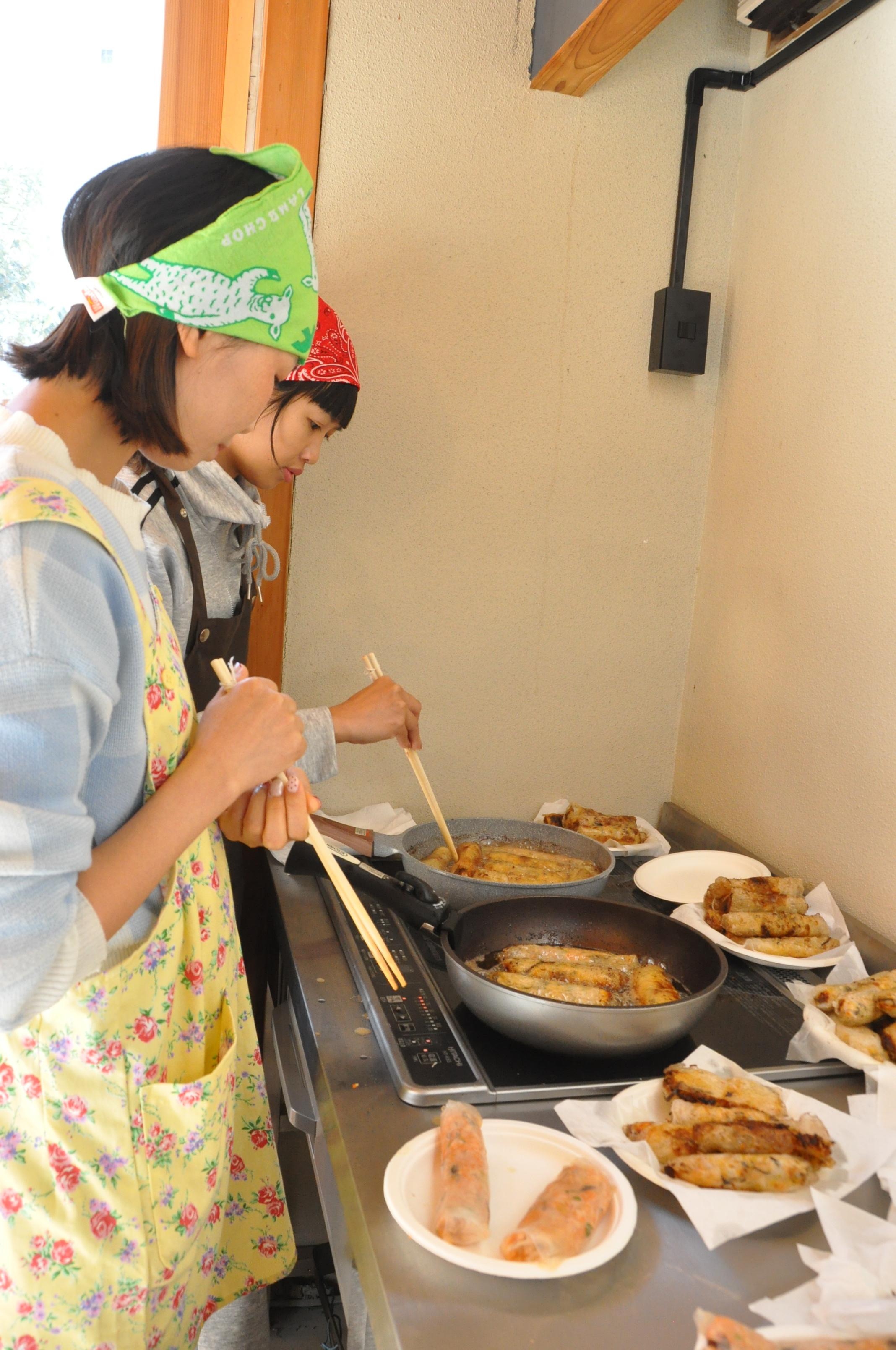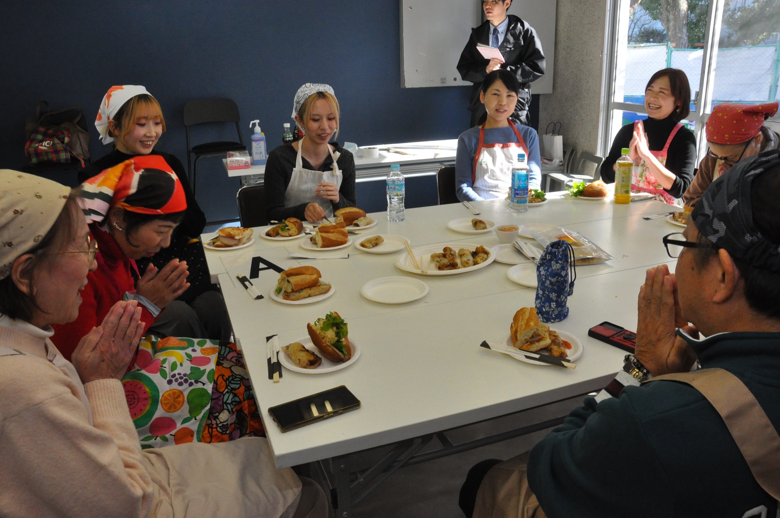 まず関西大学外国語学部高橋秀彰ゼミの学生が、ベトナム文化をクイズを織り交ぜながら楽しく紹介。わかりやすい解説付きで参加者たちからは感嘆の声がもれていました。それぞれがベトナム語で自己紹介をし交流したところで、ボランティアのベトナム人と一緒に、ベトナム風サンドイッチ「バインミー」と「揚げ春巻き」を皆で作りました。ベトナムのソースで味変を楽しみながら美味しくいただき、最後は参加者からサプライズで感謝の歌の披露もあり、楽しい1日となりました。