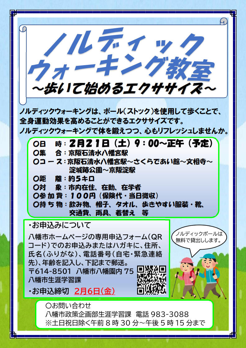 下記の専用申込フォームから、もしくはハガキに、住所、氏名(ふりがな)、電話番号(自宅および緊急連絡先)、年齢を記入し、郵便番号:614-8501、住所:八幡市八幡園内75番地八幡市生涯学習課までお申込みください。 - 申込締切
