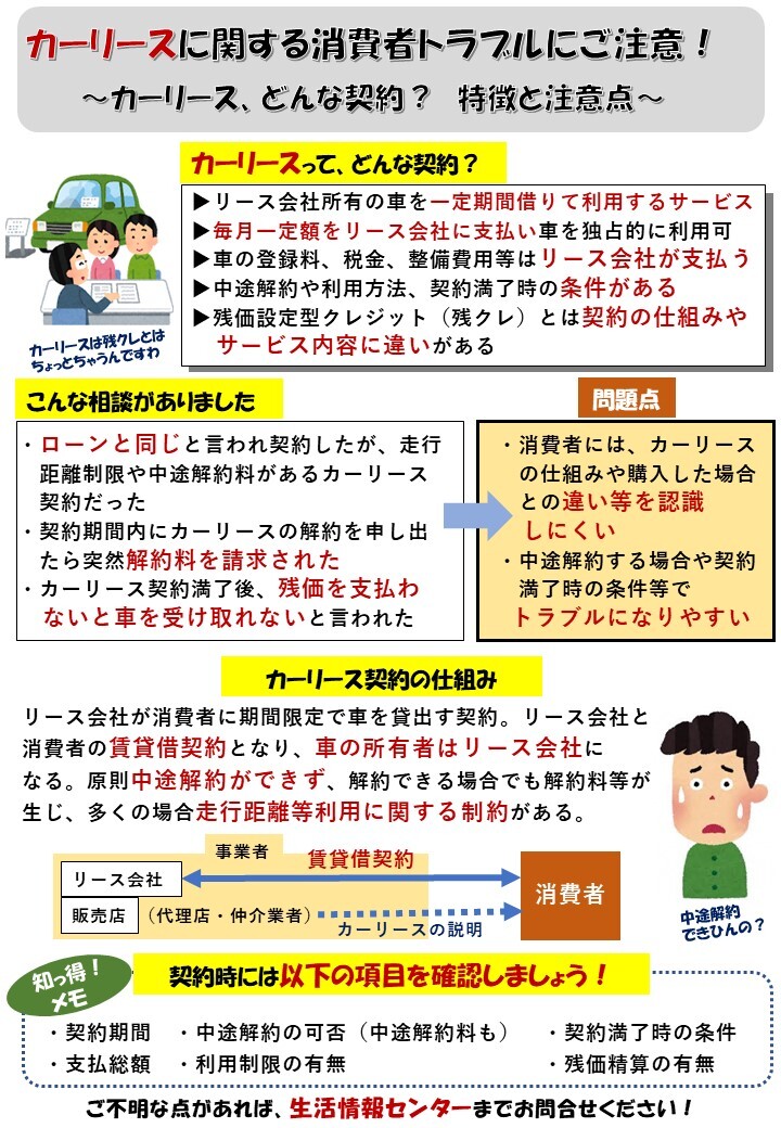 こんな相談がありました。(1)「ローンと同じ」と言われ契約したが、走行距離制限や中途解約料があるカーリース契約だった。(2)契約期間内にカーリースの解約を申し出たら突然解約料を請求された。(3)カーリース契約満了後、残価を支払わないと車を受け取れないと言われた。これらの相談の背景にある問題点は、(1)消費者には、カーリースの仕組みや購入した場合との違い等を認識しにくい。(2)中途解約する場合や契約満了時の条件等でトラブルになりやすい。の大きく2点が挙げられます。