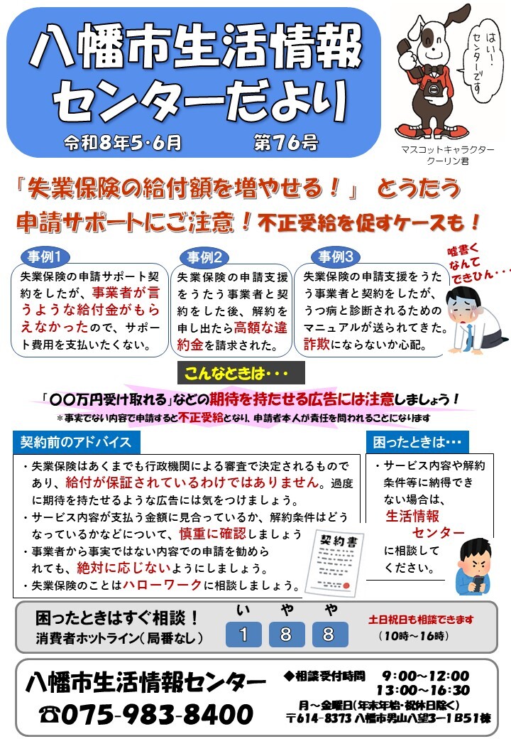 事例1)失業保険の申請サポート契約をしたが、事業者が言うような給付金がもらえなかったので、サポート費用を払いたくない、という事例。事例2)失業保険の申請支援をうたう事業者と契約をした後、解約を申し出たら高額な違約金を請求された、という事例。事例3)失業保険の申請支援をうたう事業者と契約をしたが、うつ病と診断されるためのマニュアルが送られてきた。詐欺にならないか心配、という事例。